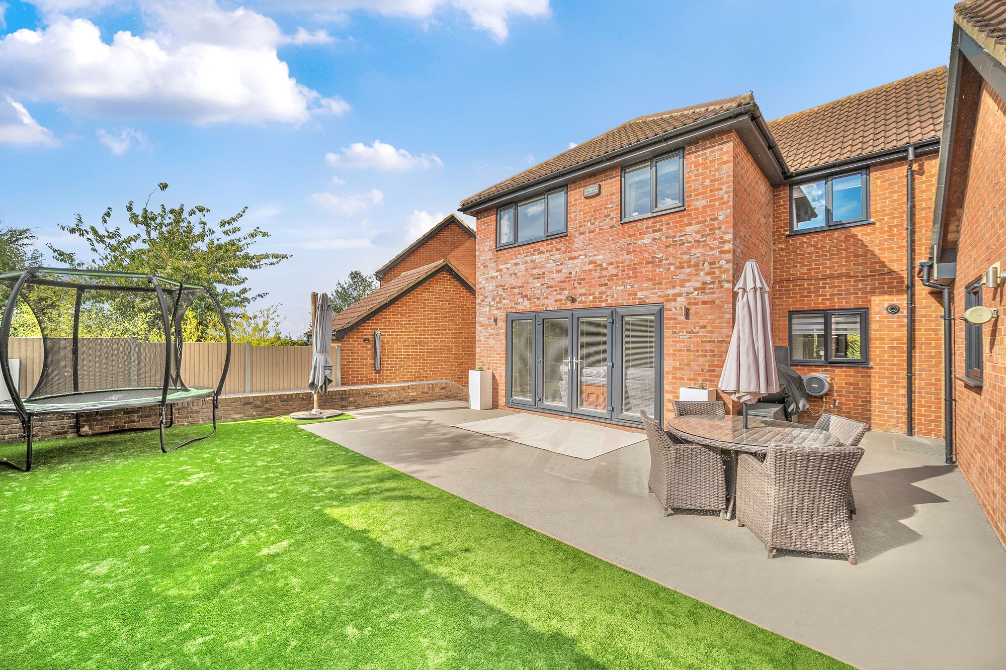 Not to be overlooked, the landscaped, south-facing rear garden provides a peaceful retreat, perfect for soaking up the sun or enjoying outdoor meals. This exquisite space features an artificial lawn and creates a serene environment for relaxation or al-fresco dining.