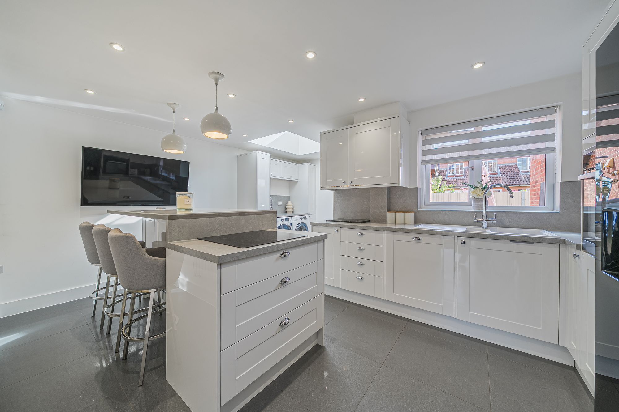 Step inside to discover a truly versatile home designed for modern living that has been thoughtfully extended to provide even more living space, ensuring comfort and convenience. The heart of the home is the high-spec, eat-in Kitchen. Featuring tasteful units and counter-tops, feature island and ample storage with the added convenience of a utility area is a culinary dream, perfect for hosting gatherings or simply enjoying a quiet meal at home. The oversized lounge offers an open-plan dining area creating the perfect space for those like to entertain. With a built in media wall and dual aspect, the lounge offers a plethora of natural light and space creating the perfect environment to relax and unwind with the family. If that wasn’t enough an additional versatile reception room at the rear of the property with separate toilet would make an ideal fifth bedroom, home office, beauty salon or games room.