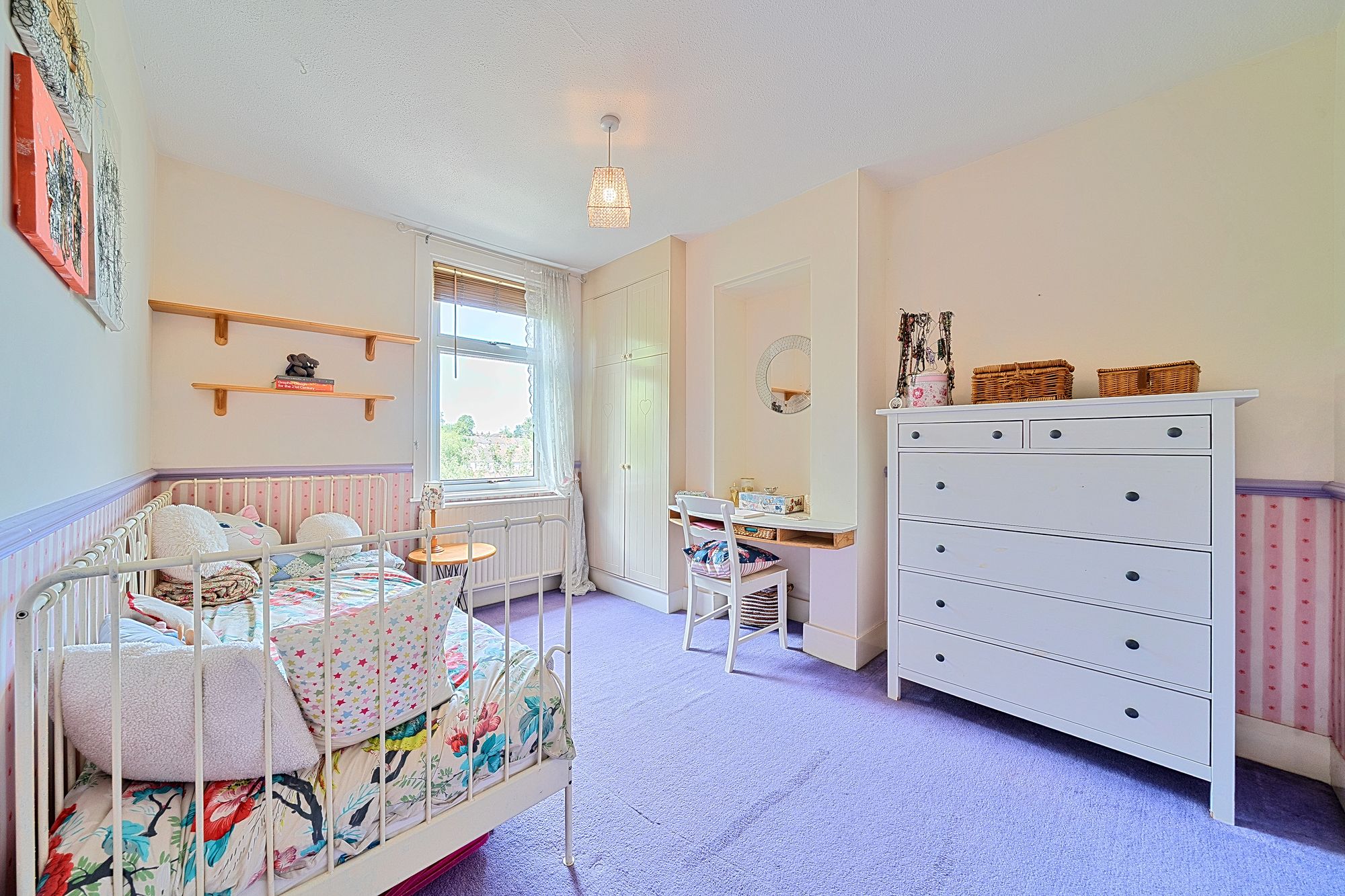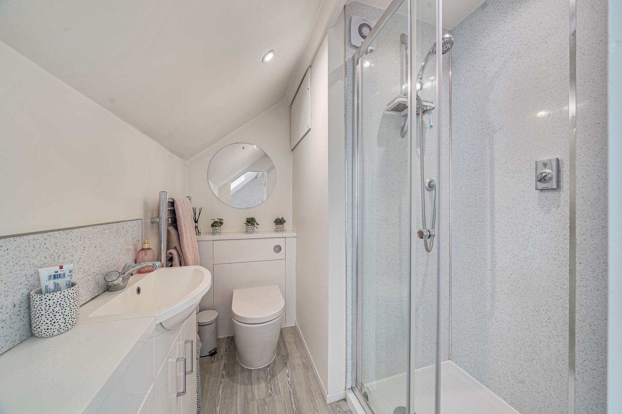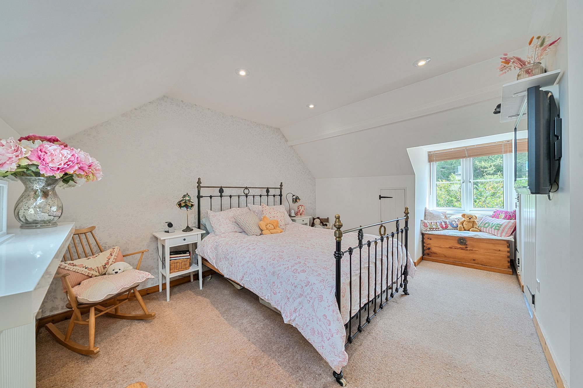 The second floor leads up to the principal bedroom, which occupies the entire top floor, offering a private retreat with a charming window seat, eaves storage and a sleek en-suite shower room.