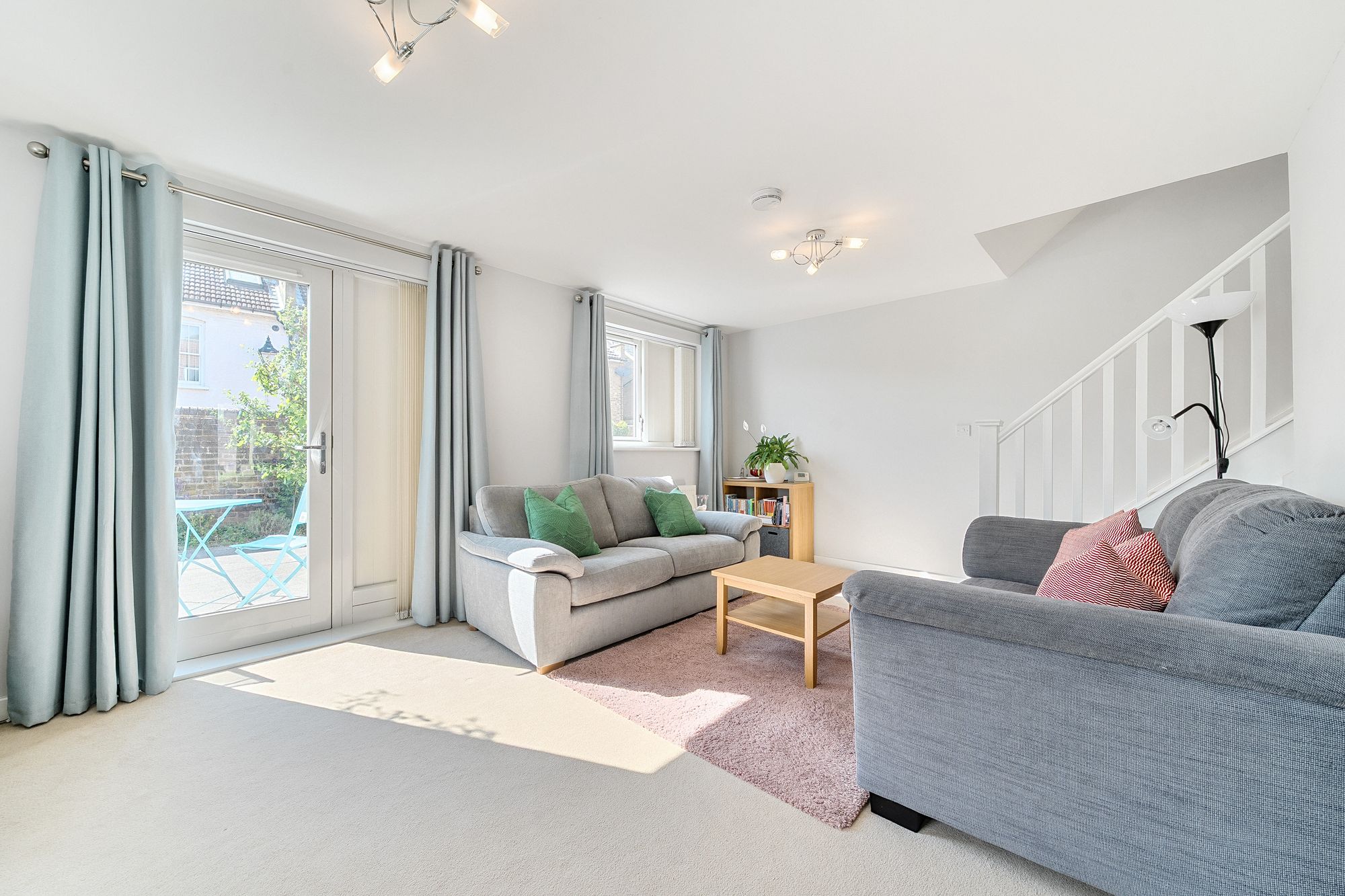 The dual-aspect ground floor features a welcoming living room with a charming bay window and west facing terrace, a convenient guest WC, and a well-appointed fitted kitchen/diner with direct access to the east facing rear garden.