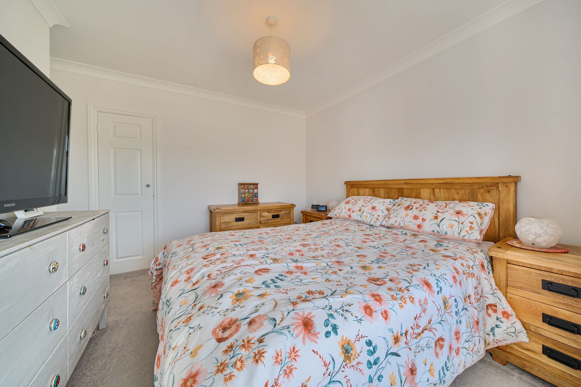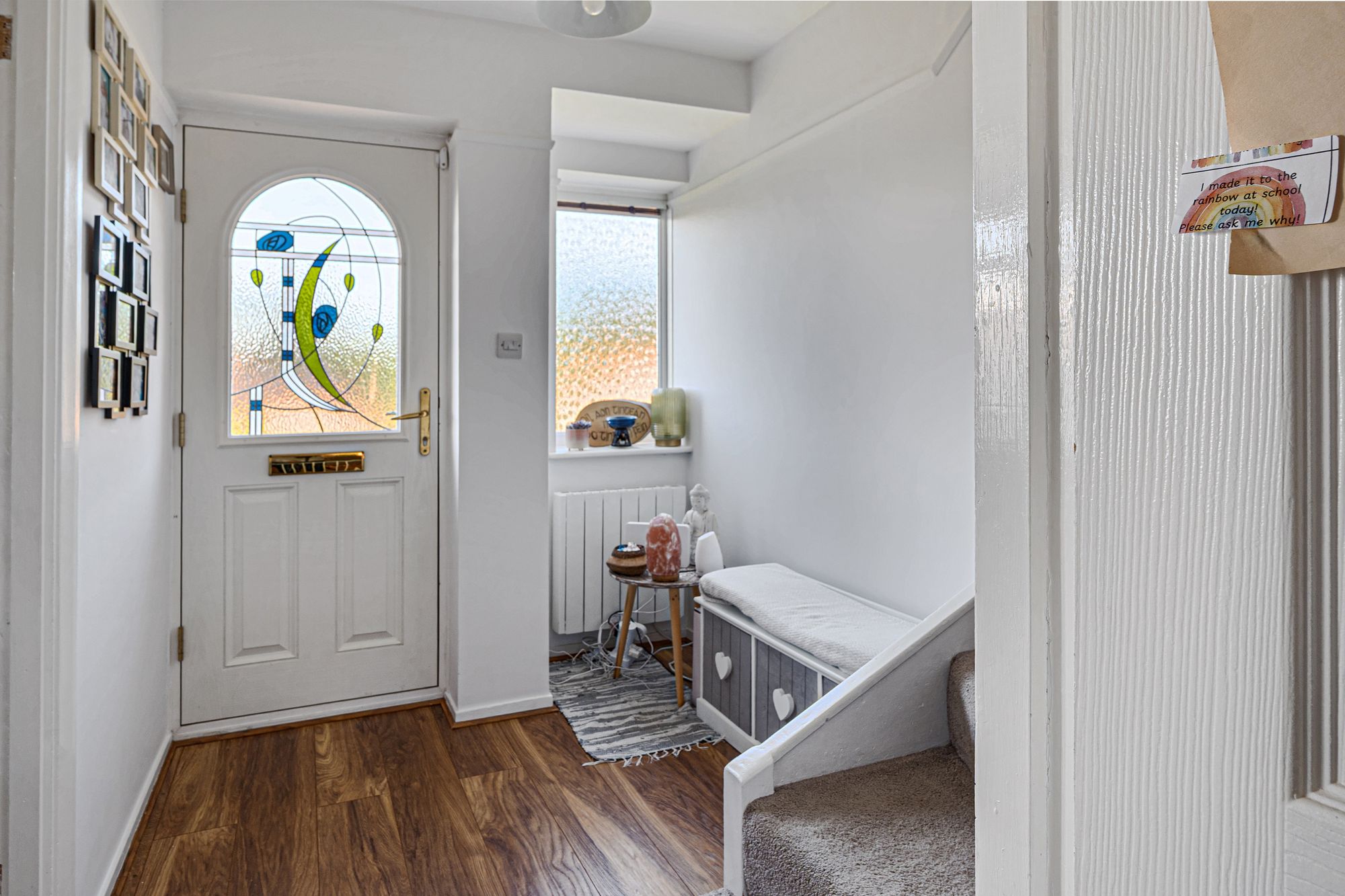 The living room to the front aspect boasts a charming bay window, inviting ample natural light into the space.