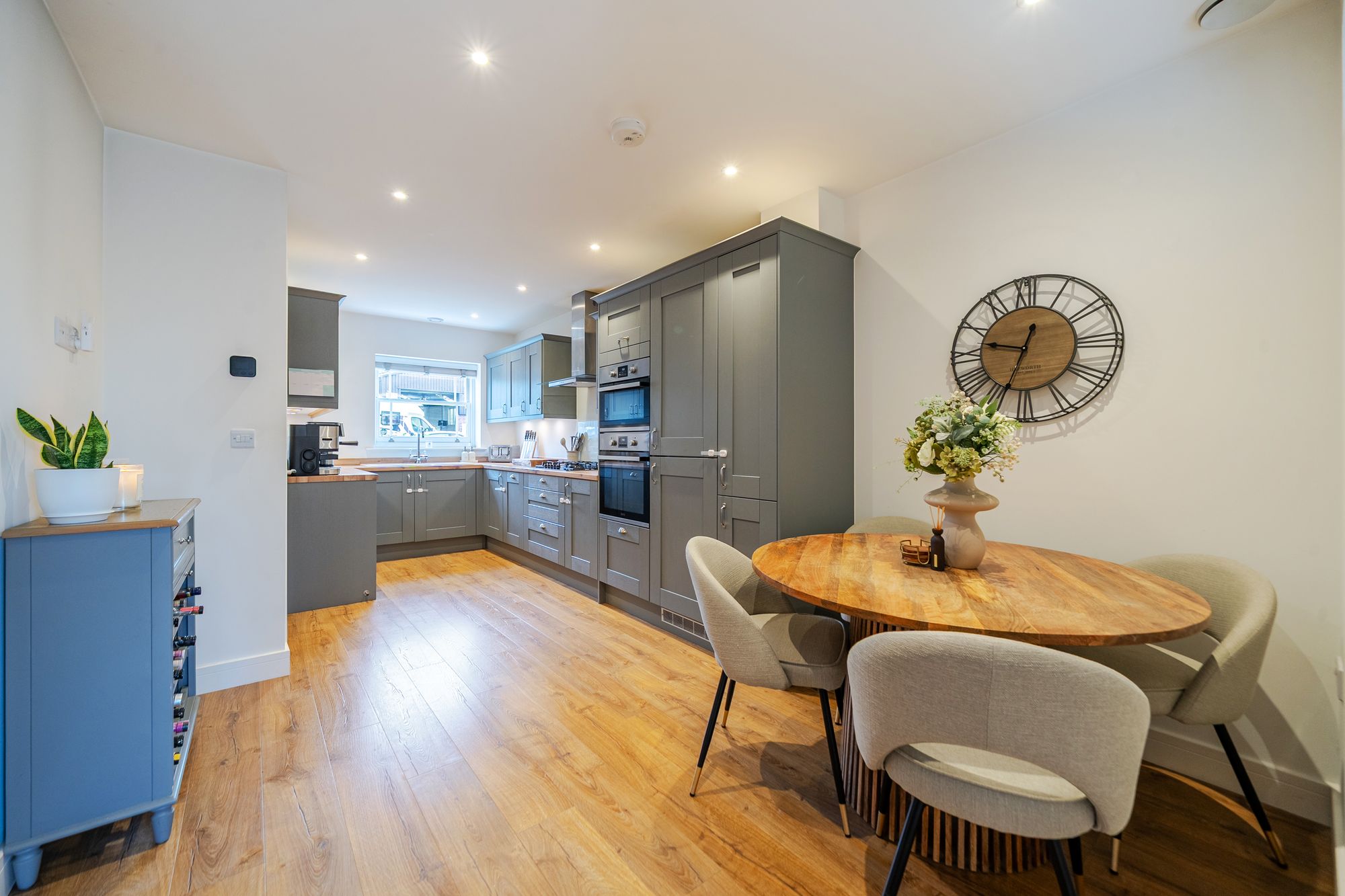 Inside, a welcoming hallway leads you into a bright hallway and then into a sleek open-plan kitchen and dining area, thoughtfully designed for modern living. With quality fittings, integrated appliances and ample worktop space this area creates a sociable layout that leads into the living room that sits at the rear of the property and is a lovely bright room with direct access to the rear garden. For extra comfort the ground floor has under floor heating.