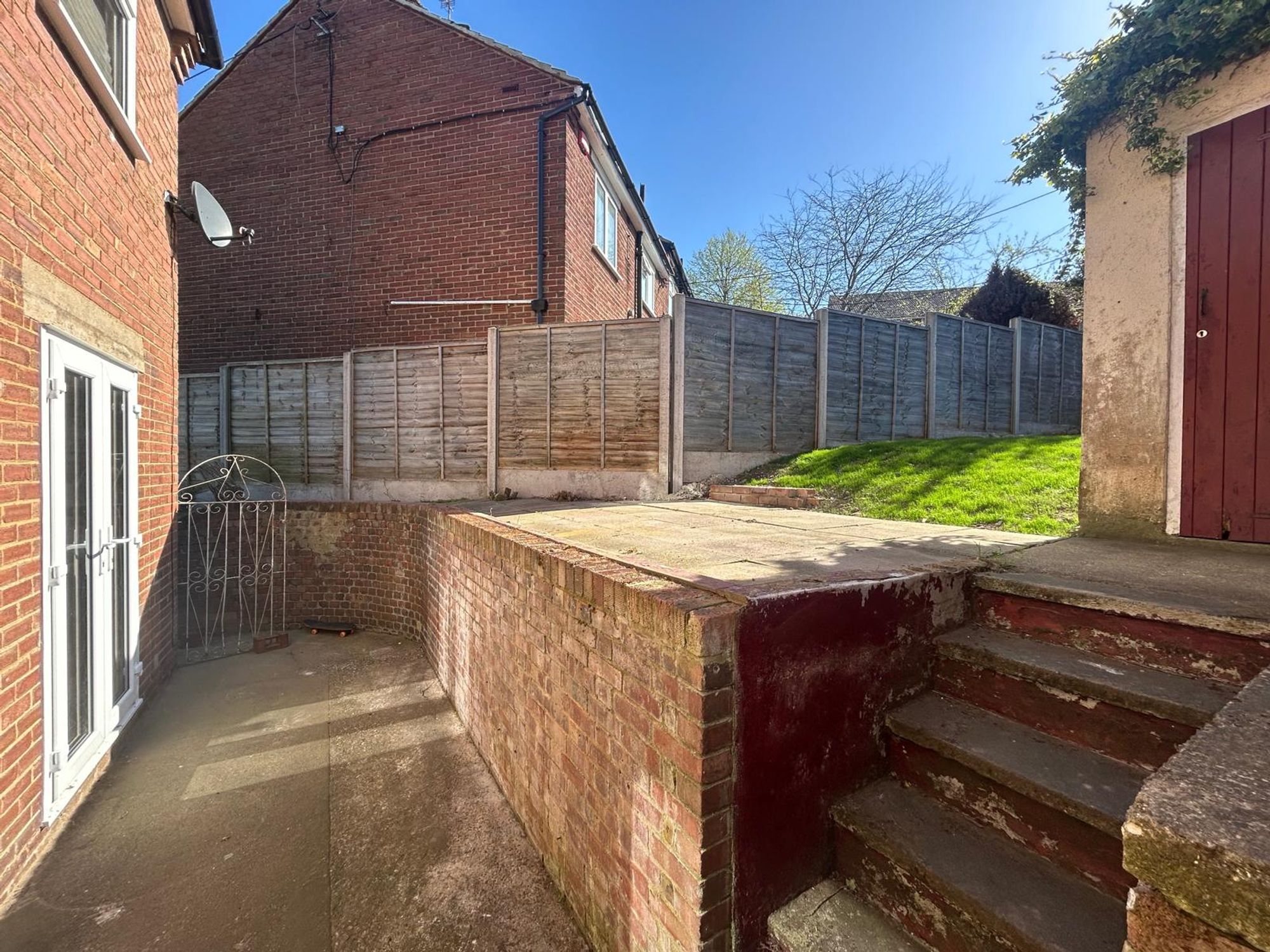 At ground level there is a patio area with steps up to a raised patio and lawn with outbuilding.