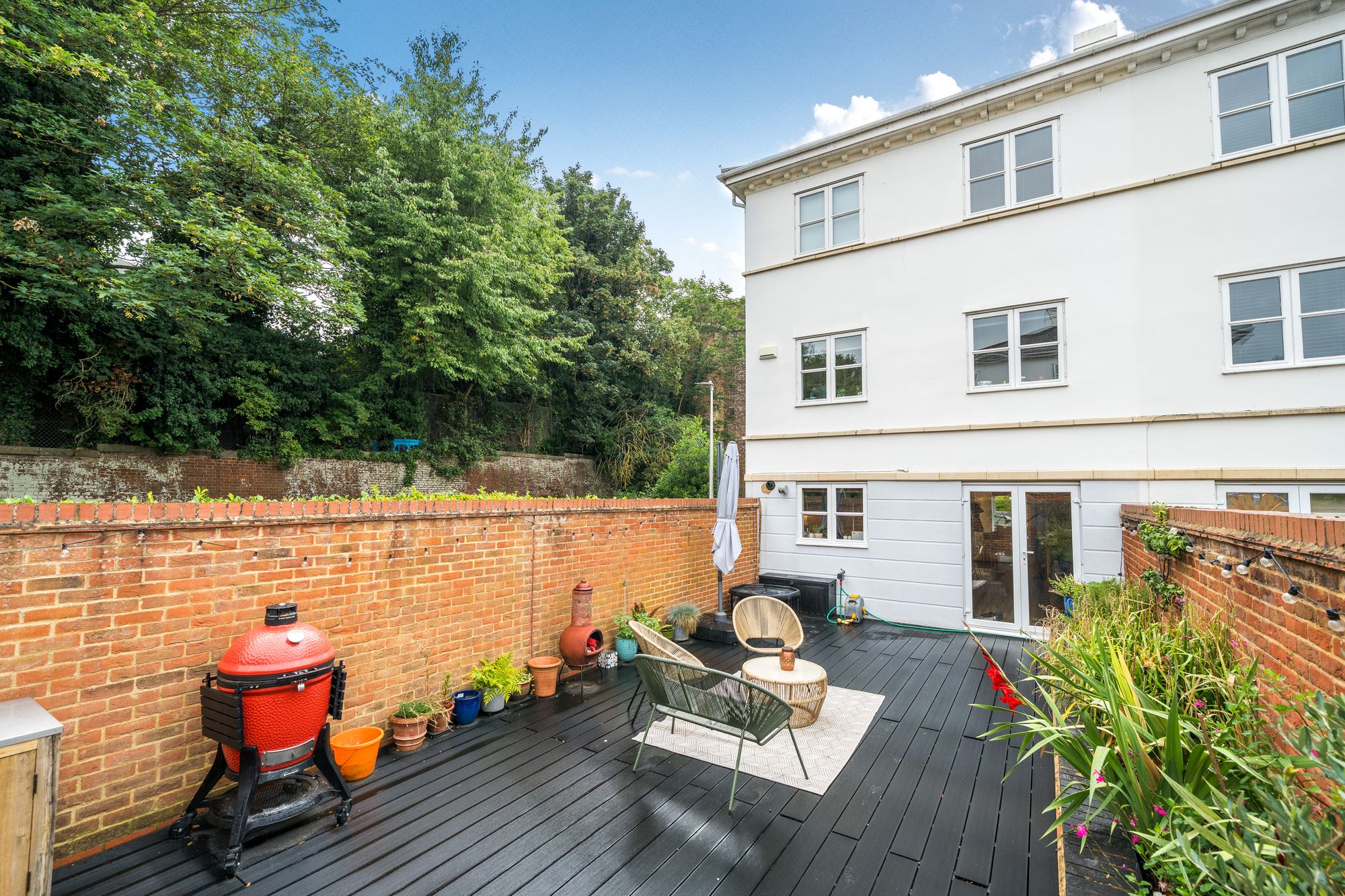 Outside, the fully decked south-east-facing garden offers a low-maintenance space that can be enjoyed year-round, while the rooms to the front of the property overlook the historic Fort Clarence, which dates back to the early 1800’s.