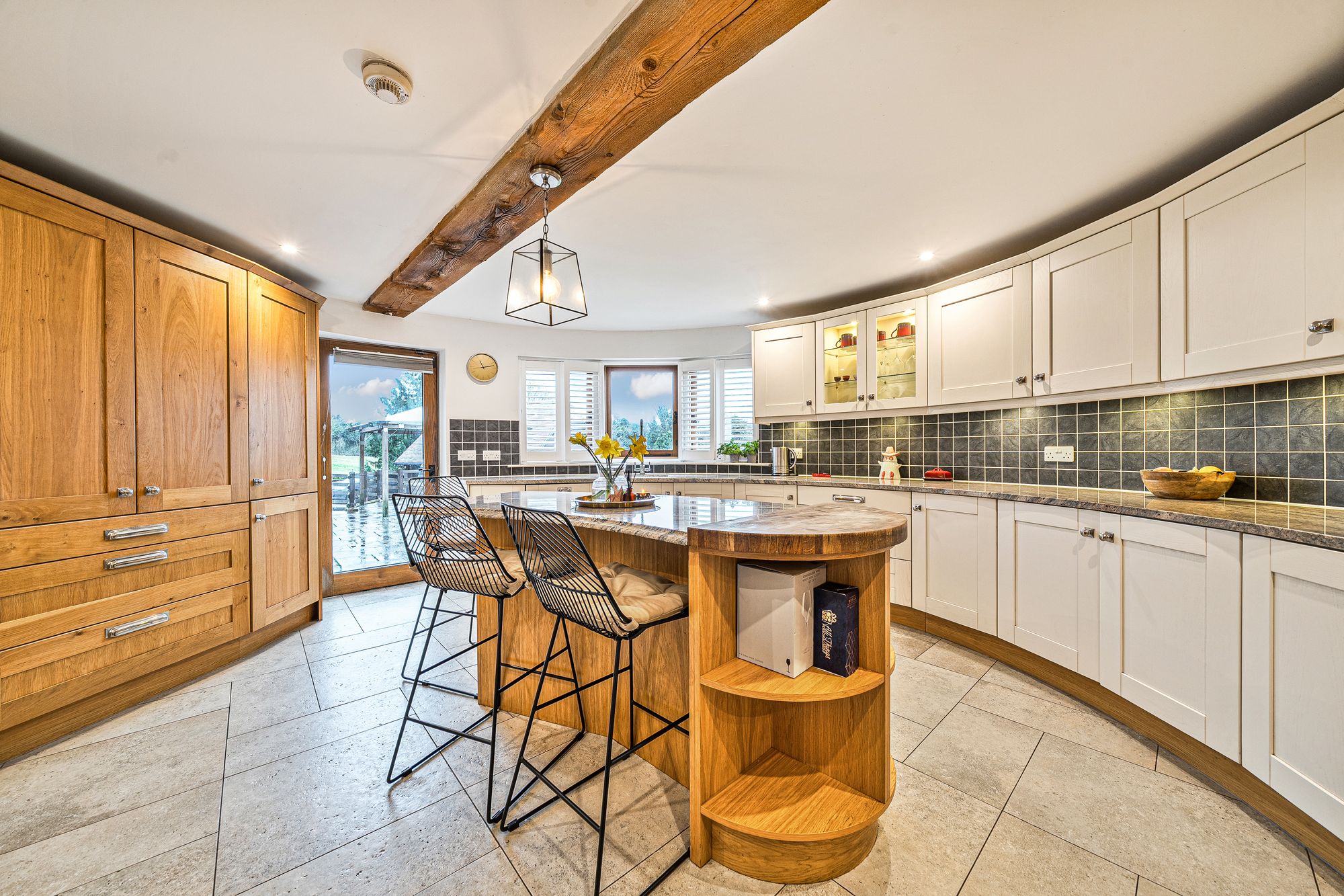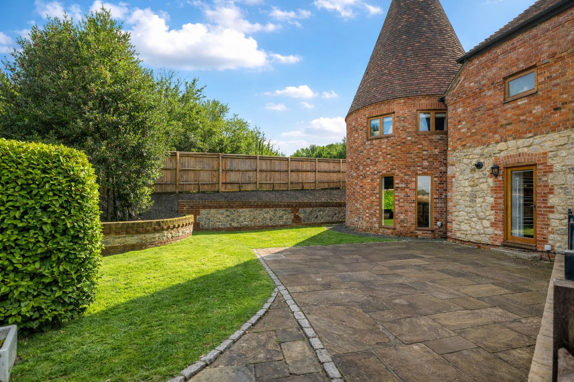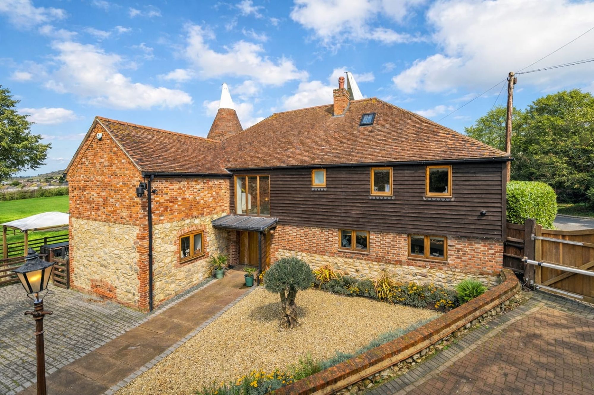 A 4,300sq ft Oast House with six bedrooms and five bathrooms. Set behind electric gates with countryside views, lounge, cinema room, dining room, kitchen, study, double garage and 1/3-acre plot.