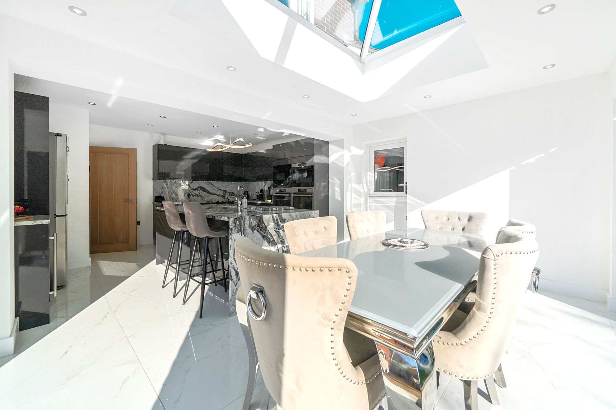 Upon entering the property, you are immediately welcomed by the spacious entrance hall that creates the inviting ambience the permeates through-out the property. The heart of this home is the stunning eat-in kitchen located at the rear of the property, a space that effortlessly combines style and functionality. The sleek design is complemented by stone counter-tops, a feature island, high-end appliances, and ample storage, making it a culinary delight for any aspiring chef. With bi-fold doors its ideal for those that like to bring the outdoors in! Adjacent is a separate utility room, adding to the convenience of daily living. The interiors reveal a grandeur that commands attention, with two enticing reception rooms that promise flexibility and comfort.