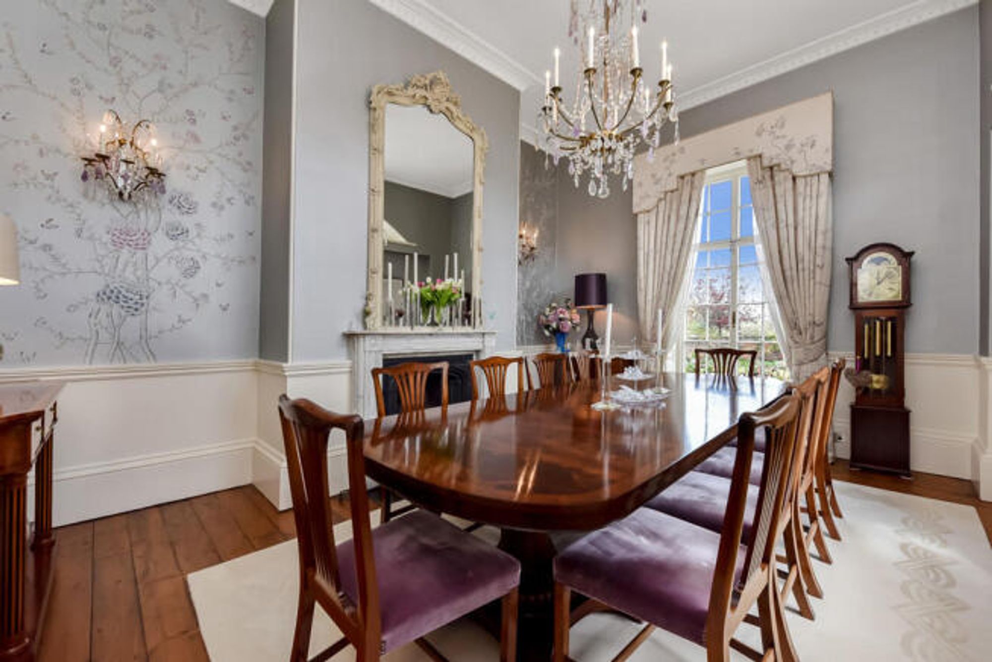 With five bedrooms and a wealth of original features, the home blends timeless character with luxury living. Highlights include a grand entrance hall with spiral staircase, a formal dining room adorned with a 1700s chandelier and De Gournay wallpaper, and an atmospheric river-facing sitting room with French doors to the garden.