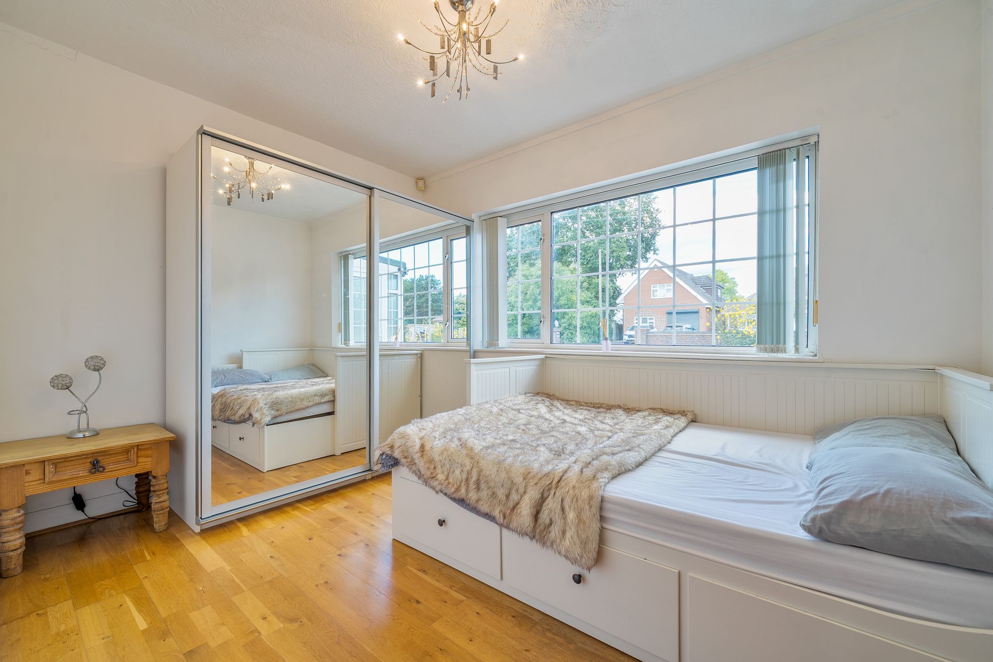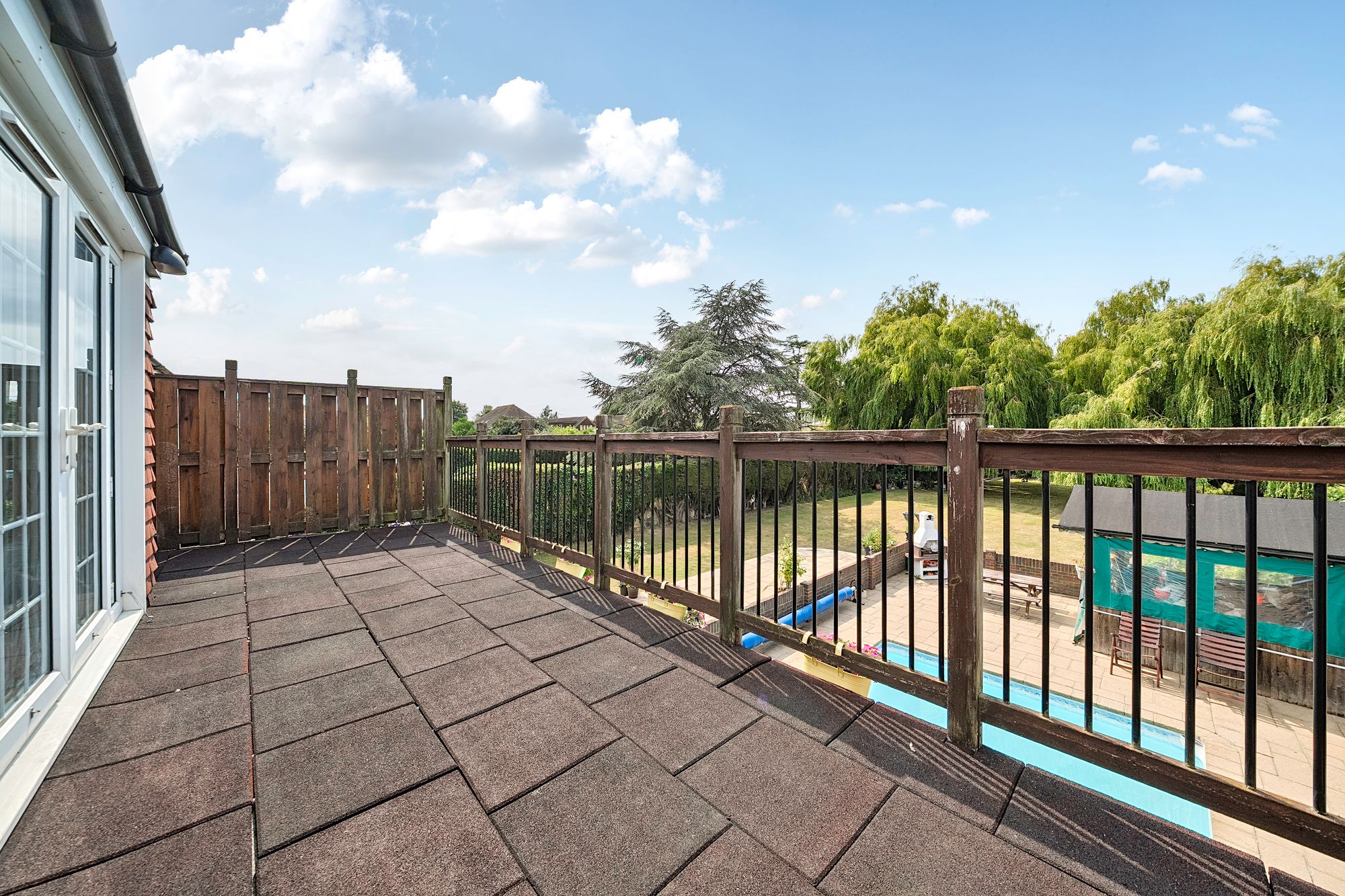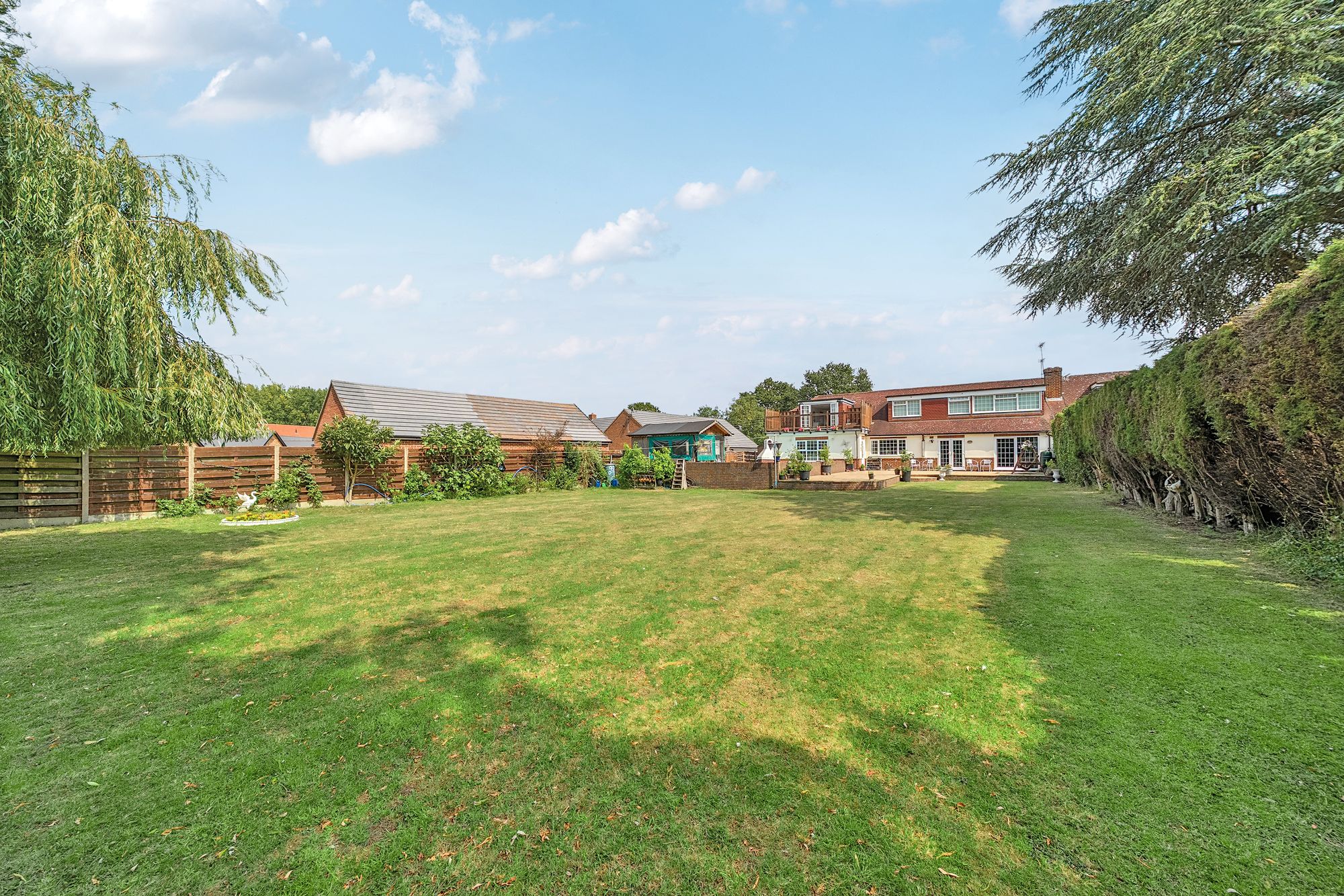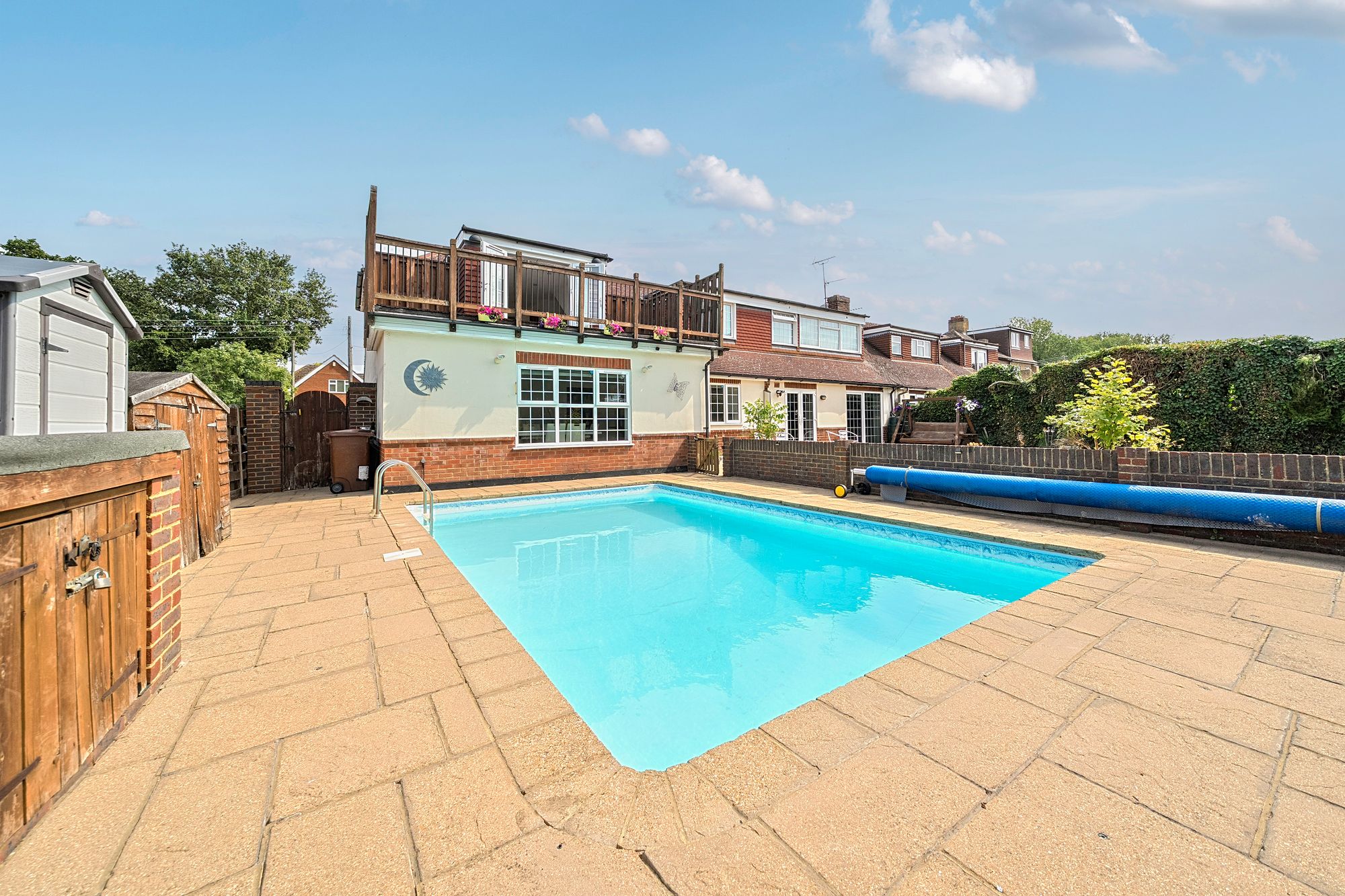 The sizeable west-facing rear garden presents a tranquil retreat, complete with a swimming pool for relaxing and entertaining in style. Perfect for outdoor gatherings or private relaxation, this space offers endless possibilities for enjoying the fresh air and sunshine with both a patio area and significant sized lawn with a variety of mature bushes, trees and shrubs.